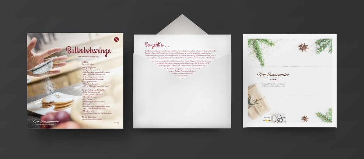 Als das Buch "100 Jahre Gassenwirt" erschien, hatten wir – um ehrlich zu sein – schon eine mega Gaudi. Es beinhaltet nicht nur leckere Rezepte zum Nachbacken, aber auch unsere hauseigenen Fotos! Der Gassenwirt gehört auch zu den Hotels, die eine sehr kreative Weihnachtspost erhalten haben: ein Faden befand sich im Brief und an ihm war ein Teebeutel befestigt. Ein anderes Mal gab es als Willkommensgeschenk im Winterurlaub eine Wärmflasche. Ja, so heiß her geht es bei uns im Pyro!