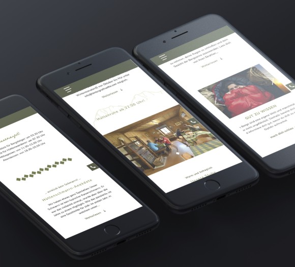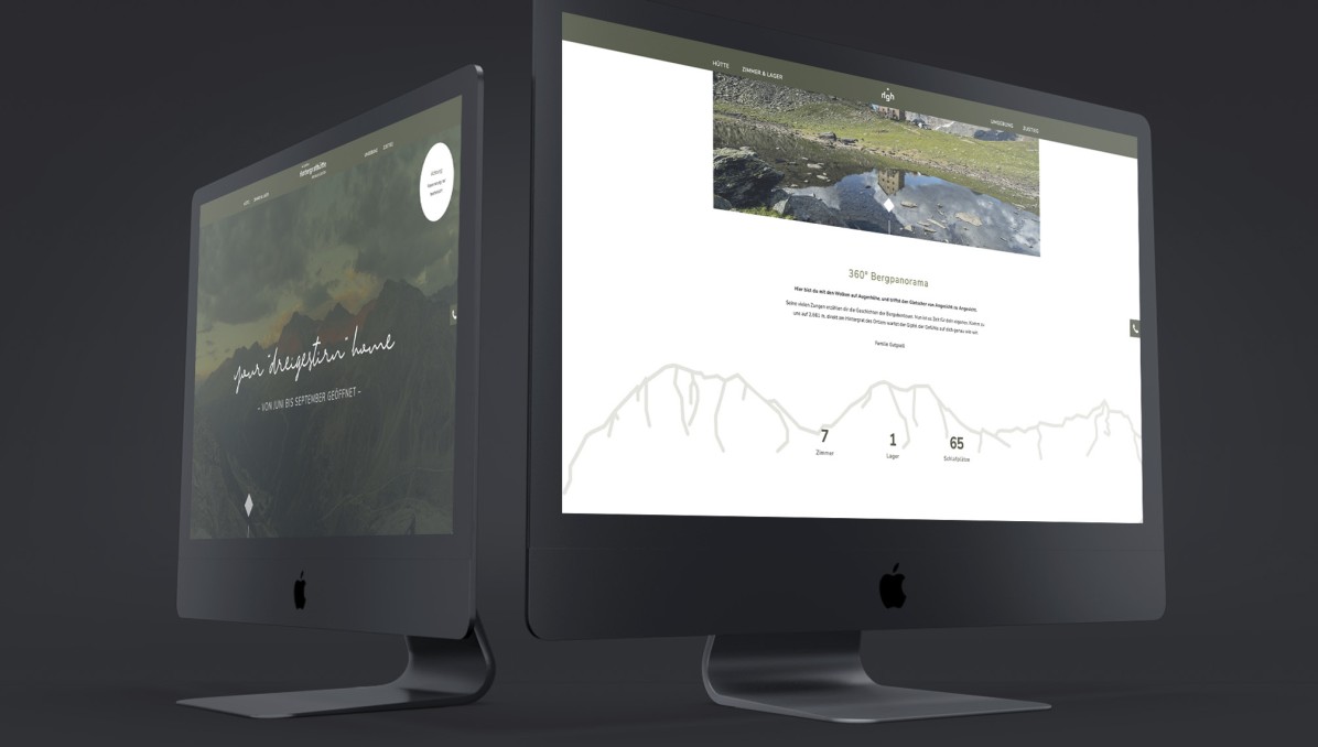 Zu unseren Kunden gehören viele Hütten. Die hintergrathütte ist besonders, weil sie oben auf 2.600 m liegt. Weil man von ihr aus auf den Ortler, den Zebru und die Königsspitze blickt, lautet der Claim "your dreigestirn home". Wir haben fotografiert, die Webseite mit viel Liebe getextet … Symbol und Emblem wurde die Raute, weil sie den Berg und das Schutzdach einfach einwandfrei symbolisiert.
