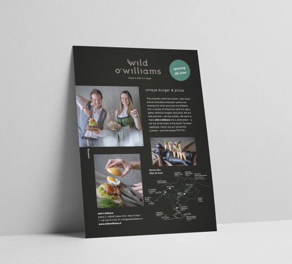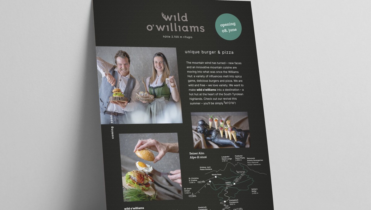 Eines unserer wilden Projekte! wild o'williams: das klingt ein bisschen irisch bzw. schottisch – das ist es auch! Die ehemalige Williamshütte befindet sich schließlich auf der Seiser Alm und vermittelt einen ziemlich "highlandischen" Habitus! Echt wow, oder? Die Kurzform funktioniert in der Kommunikation, weckt Interesse und strahlt Wildheit aus – genau so ist man in der Hütte und vor allem in der Küche von wild o'williams eingestellt. wow!