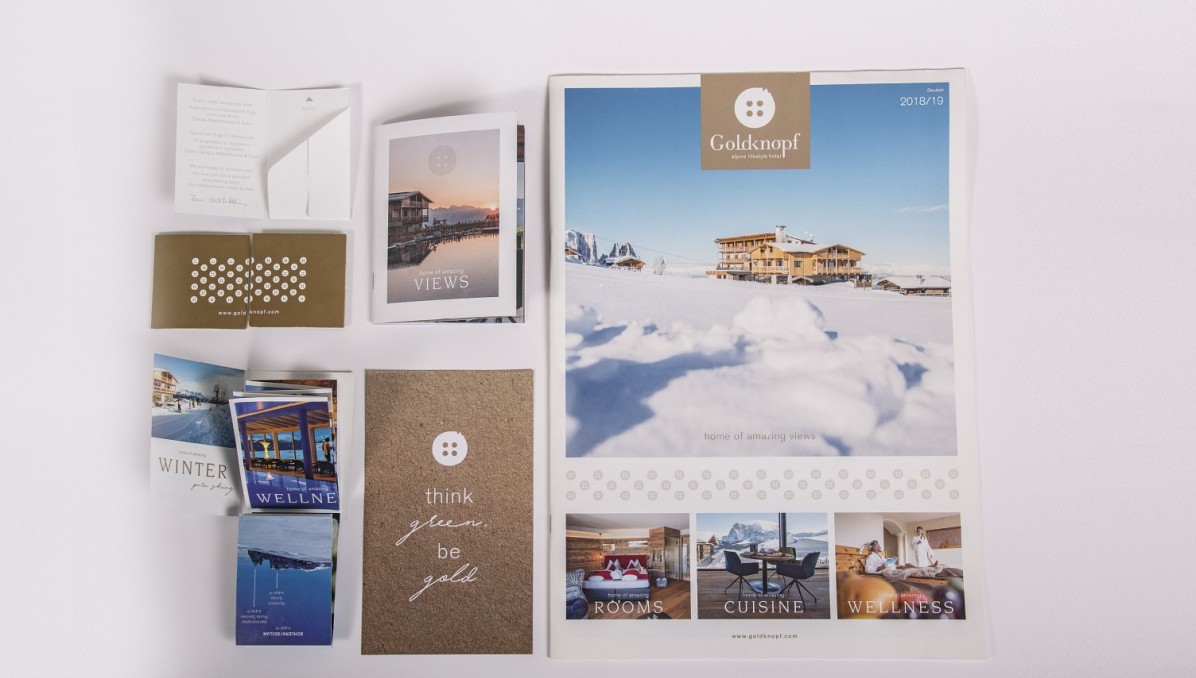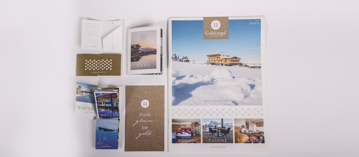 Manchmal liegt das Richtige ganz nah. Das alpine lifestyle hotel Goldknopf ist nach einem Berg in der Nähe benannt. Dass sein Logo ein goldener Knopf mit angedeuteten Bergen wird – genau genommen natürlich der Schlern – lag hier genauso nahe. Dazu gestalteten wir noch Broschen in Form und Farben des Logos, kümmerten uns um die Innenbeschilderung und mehr …