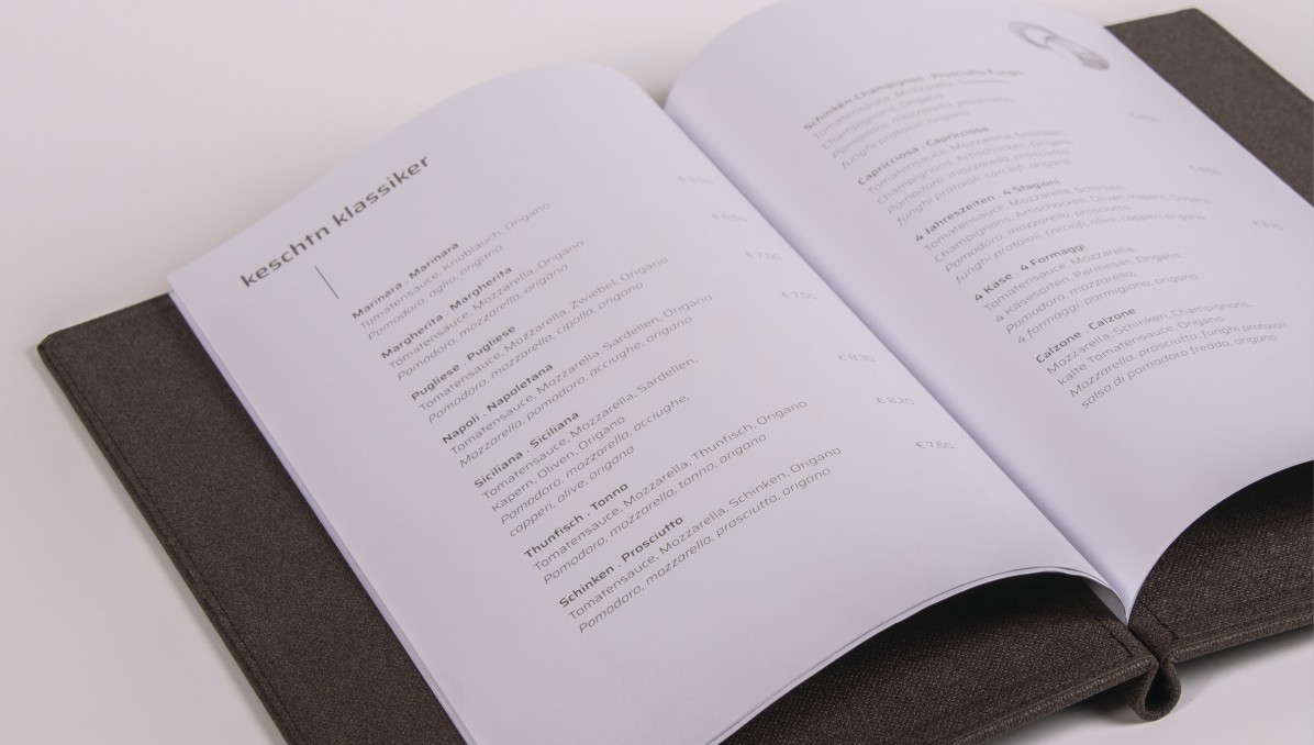 Auch einen Menükarten-Ständer hat der Oberwirt für seine Keschte bei uns bestellt! Und wir haben ihm gern einen gefertigt: aus der Kurzform des Logos, also der Marke – dem kleinen "e"! Warum das kleine "e"? Na, weil darauf die Betonung fällt und es sich in seiner Ästhetik als Buchstabe besonders gut eignet, wenn man das Wort "keschte" ausspricht. Das gibt ihm eine schöne Ladung Lokalkolorit!
