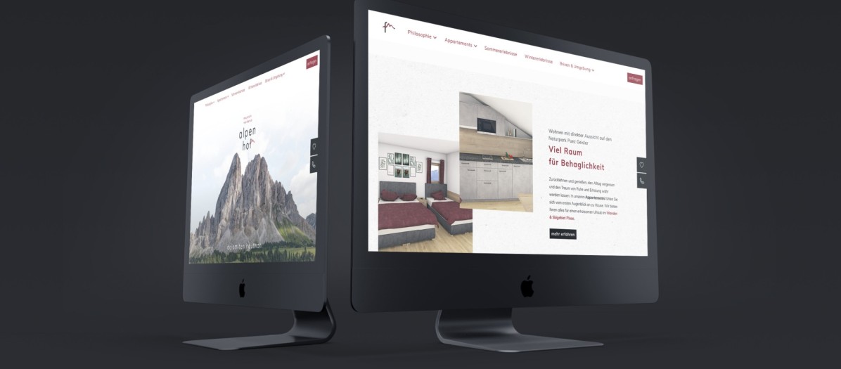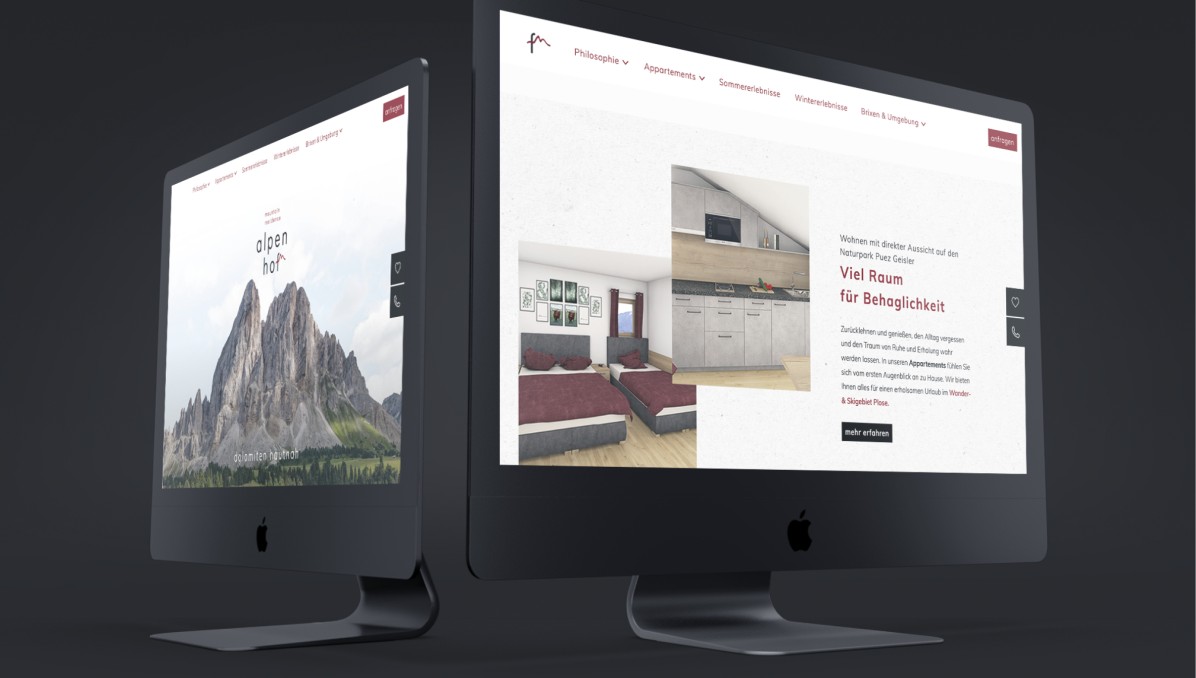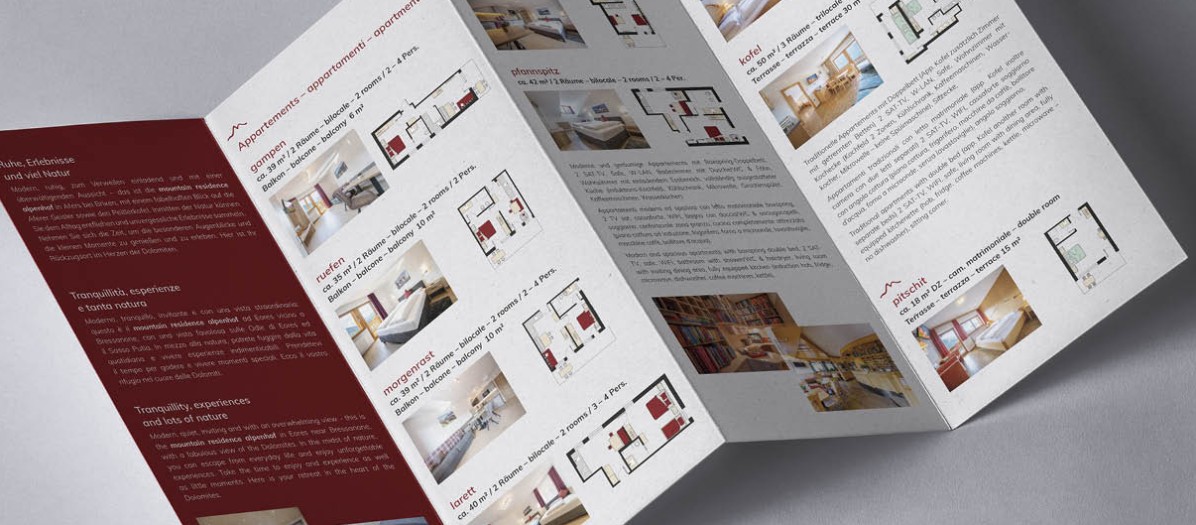 Das ehemalige Hotel Alpenhof in Afers hat seine Identität gewechselt und optimiert. Es hat sich zur mountain residence alpenhof gewandelt. In Zusammenarbeit mit der Gastgeberin haben wir eine neue Webseite erstellt und das Logo auf alle wichtigen Kommunikationsmaterialien wie Brieffamilie, Visitenkarte, Mailsignatur und vieles mehr angebracht. Dazu haben wir den Kleidungswechsel per Preopening-Broschüre angekündigt.