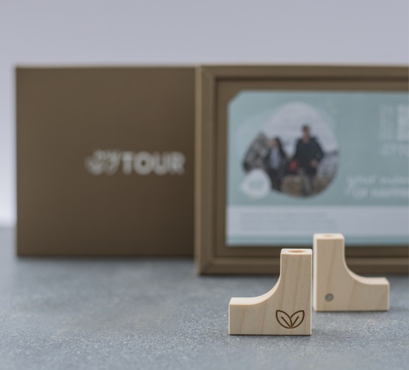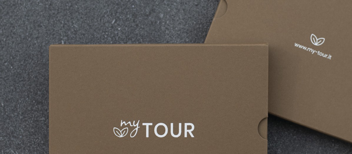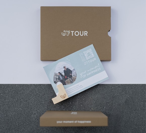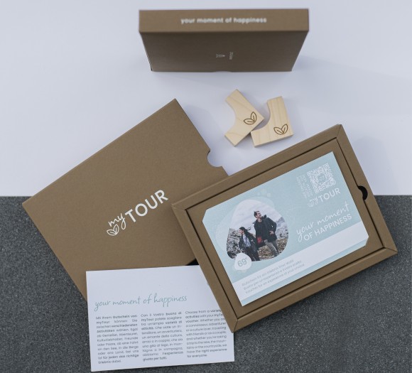Für mytour gestalteten wir einen Gutschein der ganz besonderen Art: Eine Schachtel öffnete sich durch sanftes Ziehen. So wurde der Gutschein sichtbar, der durch Schlitze im Karton befestigt war. Beigelegt wurden noch Aufsteller für den Gutschein. Sie sind aus Holz und mit dem Emblem gebrandet. Und das Beste davon: Weiß ist eigentlich keine Druckfarbe – deshalb haben wir auf den Siebdruck zurückgegriffen, um dem braunen Karton das gewisse Etwas zu verleihen. Um alles abzurunden, haben wir zum Gutschein das passende Werbeplakat gestaltet.