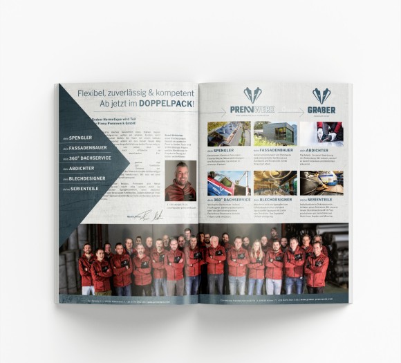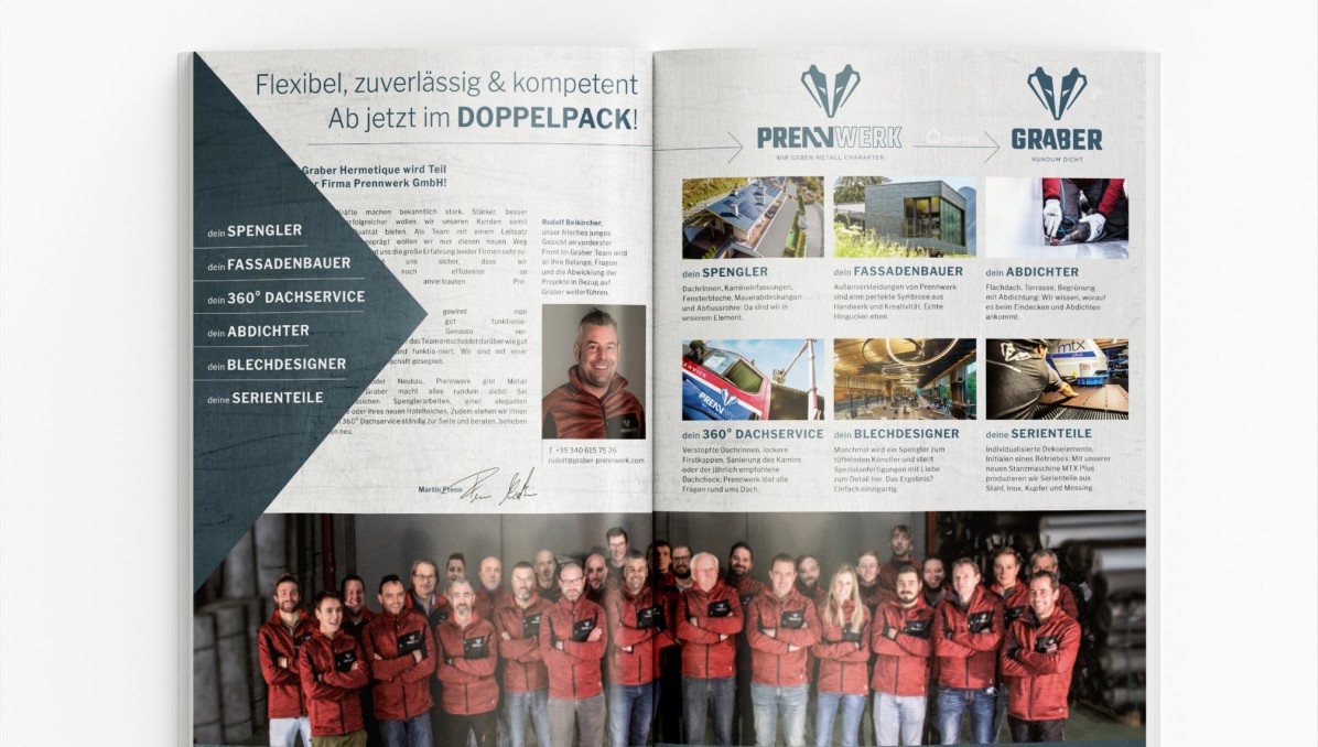 Spenglerei, Fassadenbaumeister, Abdichter, Blechdesigner … Prennwerk und Graber/Prennwerk sind vielfältig. Da war es Pflicht, alles mit einem eindeutigen Logo zu kennzeichnen. Der Dachs ist da als Bildmarke perfekt – Flyer, Inserate – das alles ist mit dem Corporate Design versehen! Auch Handwerksbetriebe brauchen natürlich eine eindeutige Corporate Identity!